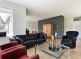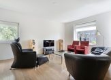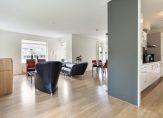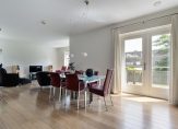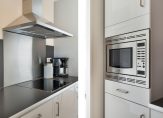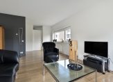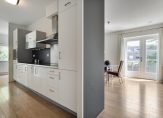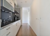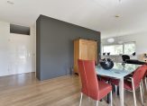 De hal leidt verder naar de royale leefruimte van het appartement. Hier bevindt zich een ruime eetkamer met directe toegang tot het balkon, een comfortabele woonkamer en een halfopen keuken voorzien van diverse inbouwapparatuur.